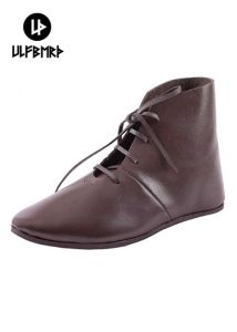 Mittelalterliche KinderschuheEin mittelalterlicher Halbschuh für Kinder, im Schnitt vergleichbar mit Funden aus z.B. Haithabu.Ein um den Knöchel laufender Riemen dient als Verschluss, für kindgerechte Stabilität und Robustheit ist die Sohle im stabilen Durchnagelverfahren befestigt.Bitte beachten:Die Robustheit von Schuhen nach historischen Mustern entspricht unter Umständen nicht den modernen Ansprüchen!Sie sind recht sensibel auf Asphalt, Betonsteinen und Schotter. Diese Bodenbeläge gab es im Mittelalter noch nicht!Wir empfehlen daher das Tragen von Trippen, ggf. Einlagen oder das Nachrüsten mit Gummisohlen beim Schuster eurer Wahl.Details:- Material: pflanzlich gegerbtes Rindsleder- Oberleder: ca. 2 mm- Sohlenleder: ca. 6 mm- Größen: 24 - 34